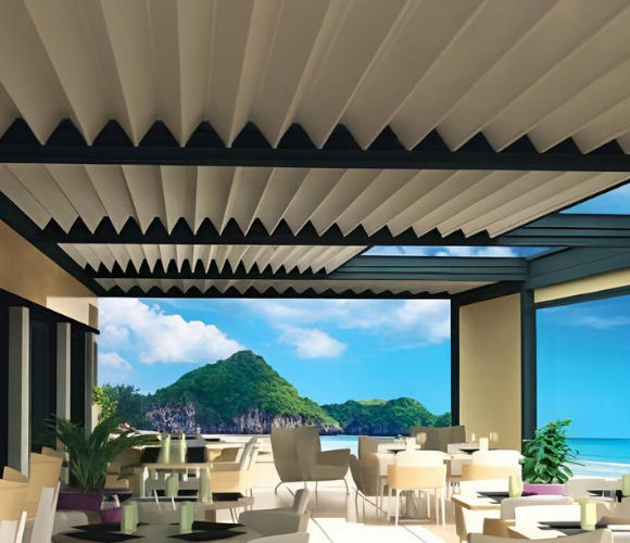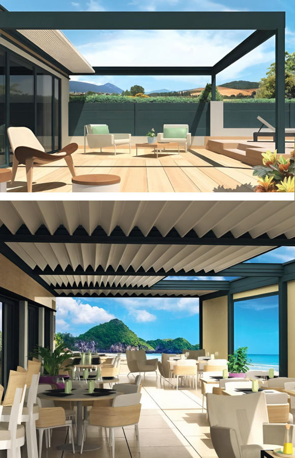 Unique dans la gamme, Horizon IV introduit une technologie rétractable à lames accordéon. Idéale pour ceux qui veulent jouer avec les éléments, elle s'ouvre largement pour laisser passer la lumière ou s'efface totalement pour laisser le ciel embrasser l'espace. En version îlot ou adossée, elle devient un toit vivant, esthétique et mobile.